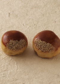 干しあんずをもう一度柔らかく戻し、白餡に練りこんで焼き饅頭にしました。和菓子には珍しい甘すっぱい味が新鮮なおいしさです。